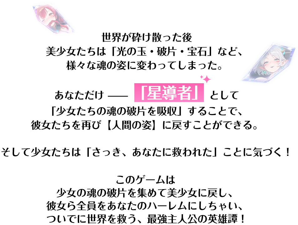 魔法の才能を持つ少女。 世界崩壊で魂は光の欠片となるが、星導者であるあなたに触れられ、少しずつ再生していく。 純粋さを残したまま神秘的な魅力を宿し、旅の中で心を開いていく存在。触れるほど絆は深まり、あなたと共に世界を繋ぐ使命を歩み始める。